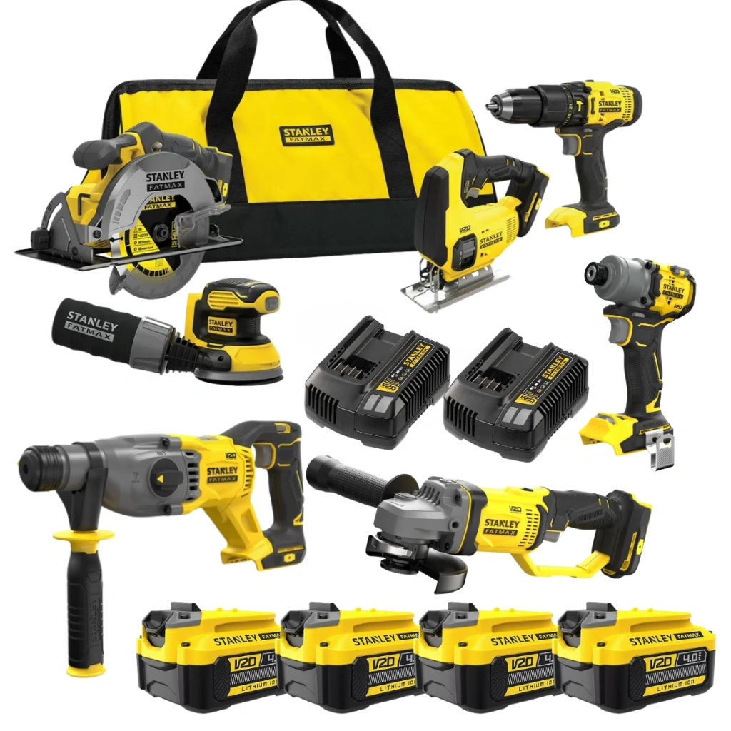 Stanley Fatmax V20 7’li Akülü El Aletleri Seti, profesyonel ve hobi kullanıcıları için tam donanımlı bir çözümdür. Set içerisinde darbeli matkap, dekupaj testere, daire testere, zımpara, kırıcı-delici, avuç taşlama ve darbeli vidalama bulunur. 4 adet 20V 4.0Ah Lithium akü ve 2 adet hızlı şarj cihazı sayesinde uzun süre kesintisiz performans sağlar. Dayanıklı taşıma çantası ile pratik kullanım sunar.