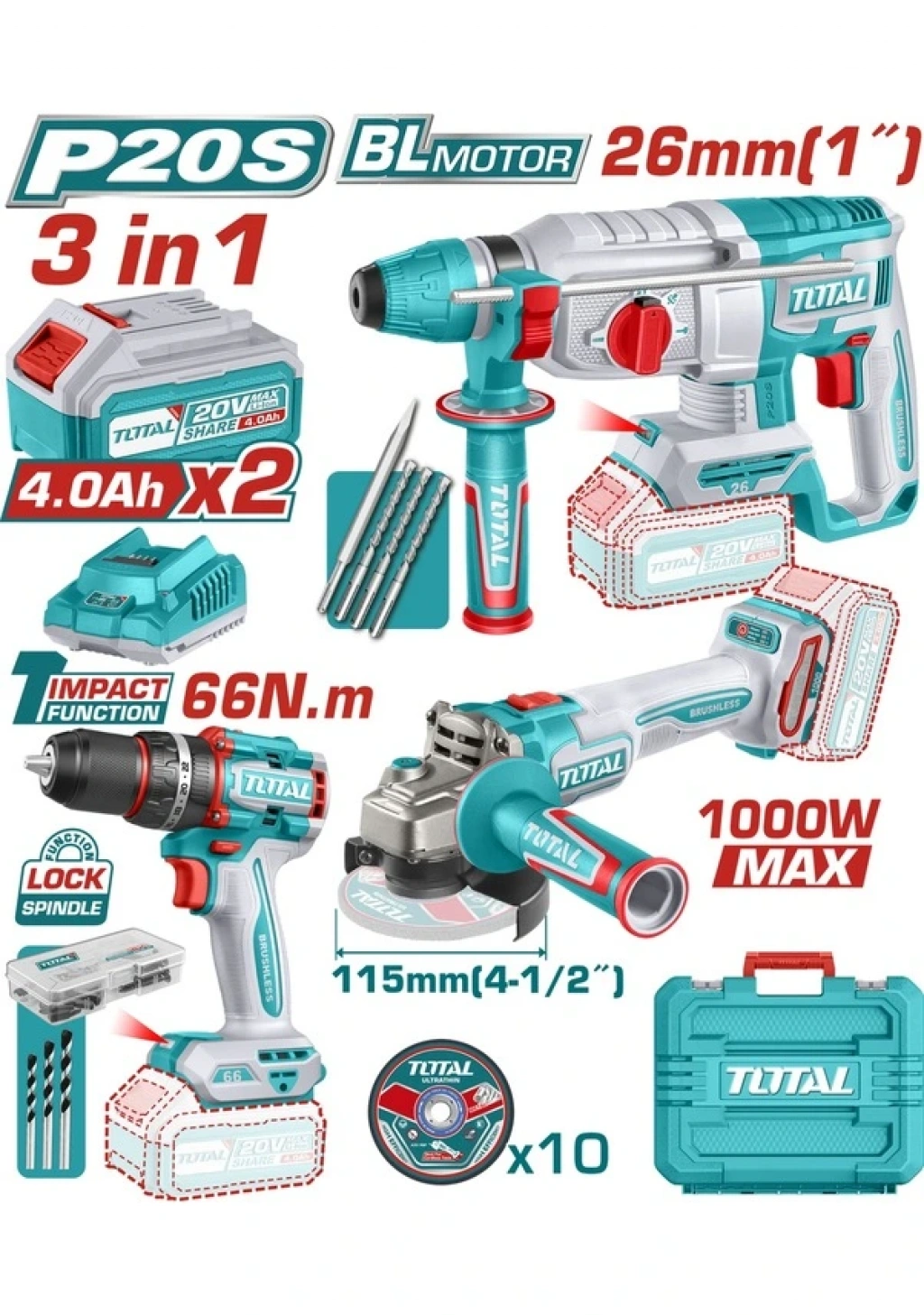 TOTAL TOSLI241198E Avantaj Set, inşaat, montaj, tesisat ve atölye çalışmalarında ihtiyaç duyulan üç temel makineyi bir araya getirir: darbeli matkap, kırıcı delici ve avuç taşlama. Dayanıklı motor yapısı, yüksek tork değeri ve uzun ömürlü komponentleri sayesinde profesyonel kullanıcılar için ideal bir iş ortağıdır.
